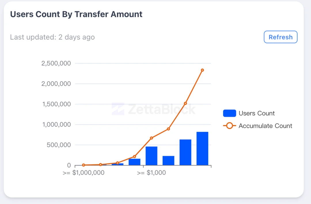 34.9%的地址交互金额小于$100,交互金额在$1000以上的地址数共66万个,占全体用户的28.6%。
