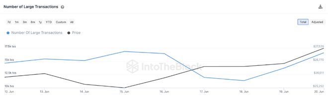 具体来说,IntoTheBlock 的数据显示,鲸鱼投资者的交易活动已连续 3 天增加。6 月 17 日至 6 月 20 日收盘期间,BTC大额交易从 11,360 笔增长至 16,360 笔。这意味着短短三个交易日内涨幅高达 47%。