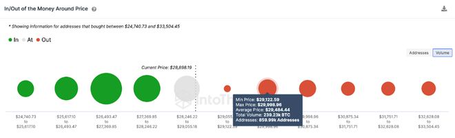 但首先,BTC 必须首先清除 29,500 美元的初始阻力位。在这里,860,000 个地址以 29,484 美元的平均价格购买了超过 239,000 个 BTC。