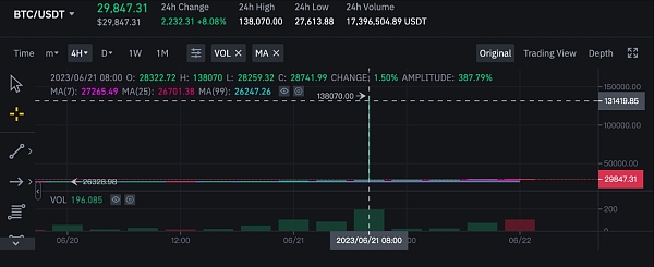 据币安美国(Binance.US)的比特币交易图表,该交易所的BTC/USDT交易价格曾在周三早上9点15至30分间,短暂飙升至最高138070美元,随即又快速回到正常价格区间,最终15 分钟级别收28874美元,波动率超过374%