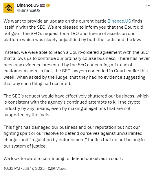美国证监会在上周末与币安宣布达成折衷协议,币安承诺,将把所有美国客户资金和钱包私钥转移回美国境内,以确保在短期内只有币安美国员工可以动用美国客户资金,但该协议仍尚待法院批准。