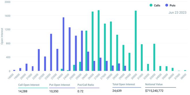 6 月 10 日,比特币价格跌破 26,300 美元,加剧了使用期权合约的交易员的看跌押注。6 月 16 日才恢复到这一水平,这解释了为什么空头将赌注集中在 27,000 美元以下的比特币上。