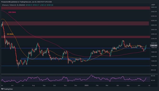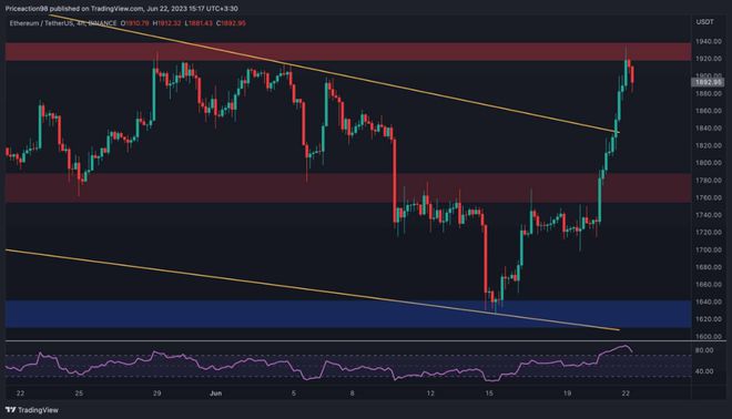 在此支撑之后,以太坊经历了反弹,成功突破了 1750 美元的水平和楔形形态的上限。下降楔形的看涨突破通常被视为积极信号。