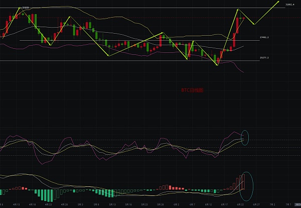 BTC短线4小时行情目前在回踩29500一线后,目前处于窄幅震荡修复阶段,日内行情上行波动不大,KDJ指标三线出现拐头,MACD指标绿色实体动能柱放量,双线呈死叉向下,短线行情大概率会继续在29000上方震荡,日线6月22日K线呈上下插针阴K,6月23日K线向下触及BOLL上轨后,再次上涨,K线目前呈阳K,KDJ指标三线运行至80轴上方,MACD指标红色空心动能柱放量,综合来看:目前行情还是处于多头放量阶段,日线K线以BOLL上轨为支撑反弹,行情在阶段性震荡后,还会继续上涨,建议以低多为主