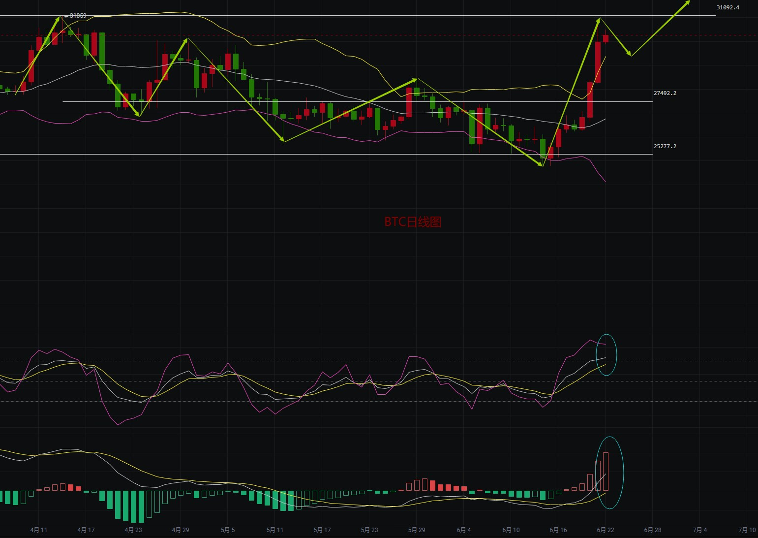 昨日给出的BTC:30600--30800空成功激活,行情在6月22日0点后行情触及30822一线后回落,最低触及29766一线,短线有1000点以上的利润空间