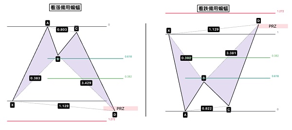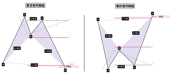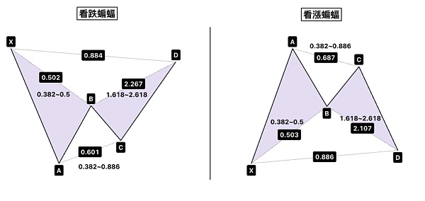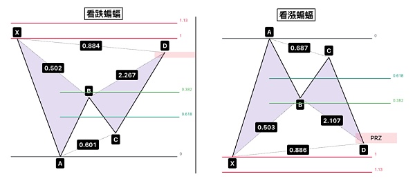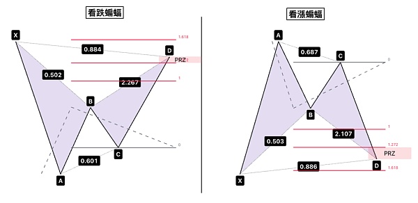 蝙蝠型态在 2001 年被发现,也是整个和谐交易中最精准的型态,之所以是最精准的是因为蝙蝠型态的特定数值恰好定义了完美的濳在反转区间。出现蝙蝠型态通常代表着对支撑压力进行深度的测试,有效的蝙蝠型态通常在濳在反转区间也会有较强力的价格行为。