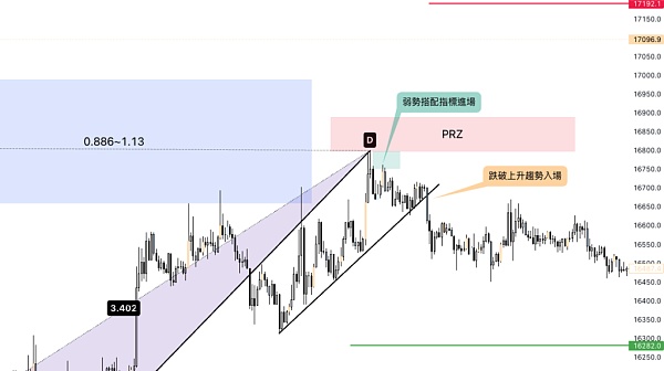 以上图为例,会出现 1、1.272、1.618 三个数值,只要使用离 D 点最接近的数值就是这个型态的 PRZ 。