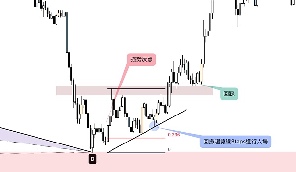二、假设在二次测试时没有进场到,我们可以继续观察小级别是否出现反转结构辅助判别寻找入场点。这边就出现了 2B 结构,延伸出小级别趋势线在 3taps 时入场观察。接着盘面延续三角上升结构,突破并回踩继续向止盈前进。