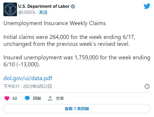 初请失业金人数稳定居高位:申请州失业救济金的人数连续第三周保持在 20 个月以来的最高水平。