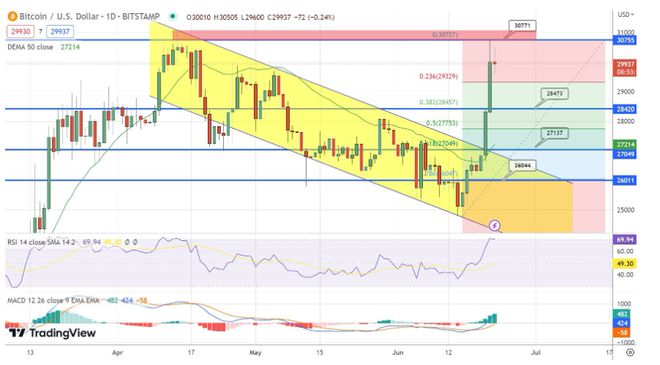 仔细观察比特币的技术分析,特别是每日时间框架,我们观察到被称为“三白兵”的三根看涨蜡烛的形成,它们将比特币的价格推向 30,000 美元的水平。