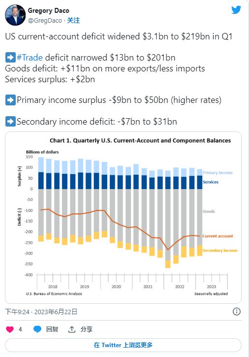 经常账户赤字扩大:衡量商品、服务和投资流动的美国经常账户赤字在2023 年第一季度略有扩大。