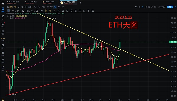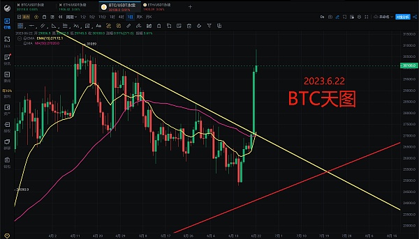 大家看ETH的天图,昨天蜡烛图突破了下降趋势线和MA50均线,今天又拉了一下,拉到前高被压下来了,一般前高都是一个阻力位,第一次不容易突破,需要试探阻力,等后面再次突破,这种格局空间就是看涨的,而且是大涨暴涨,就看你能不能拿的住。