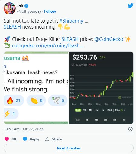 柴犬社区的一位知名成员Jolt_yourday在 Twitter 上分享了 Telegram 消息。尽管如此,他们也注意到 LEASH 价值的增加。具体来说,该推文的截图显示该代币已上涨 5.1% 至 293.76 美元。