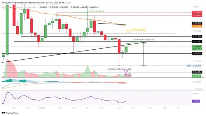 然而,如果出现看涨突破,下一个斐波那契阻力位预计在 0.08 美元左右。