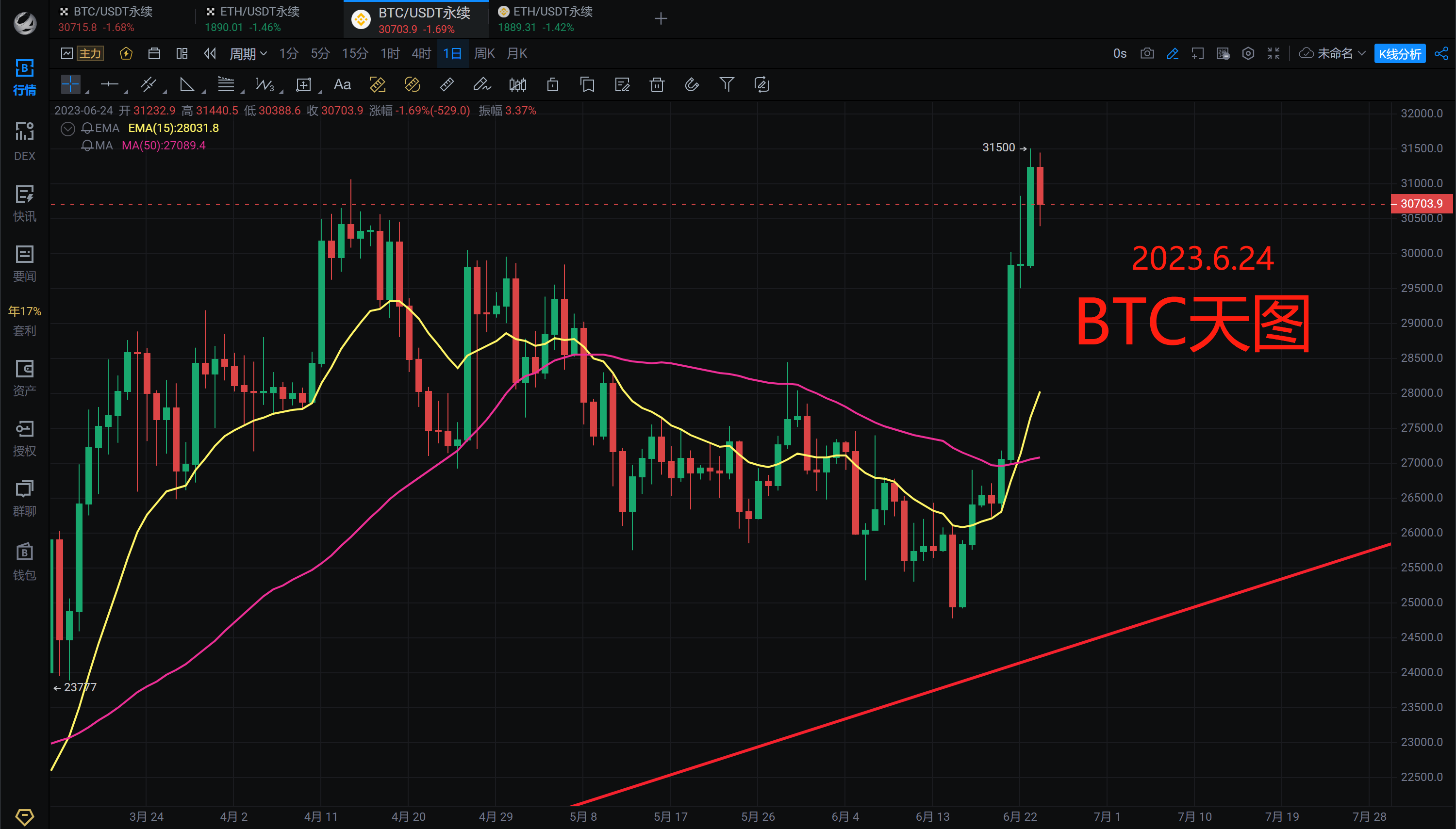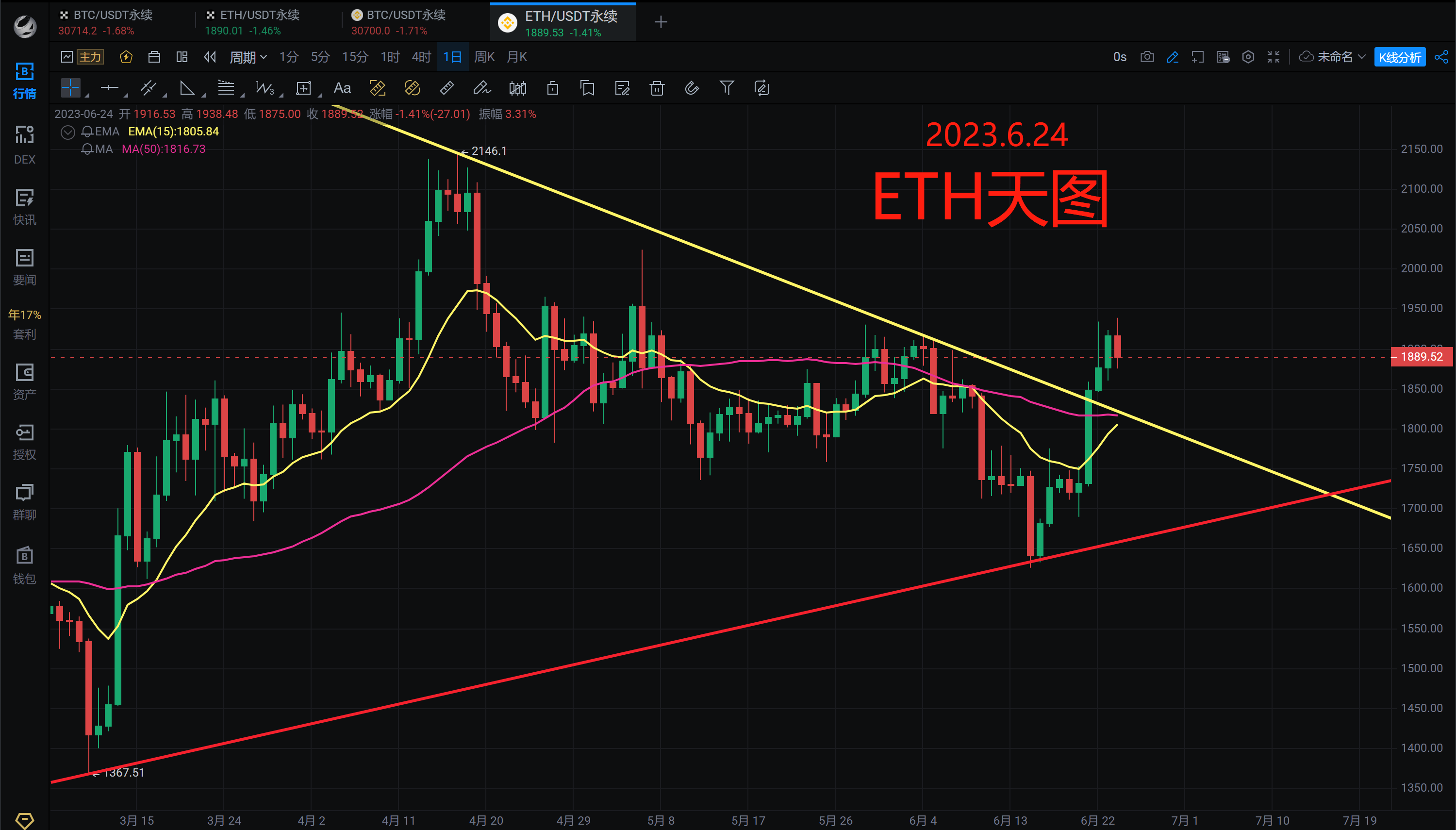 大家看天图,ETH昨天也是破了前高,但是ETH属于试探前高阻力位,今天又下来了,ETH的前高筹码太多,不容易突破。昨天和今天的蜡烛图还组成了黄昏之星,这个时候的黄昏之星可以不放在心上,哪怕下来也是两个子点,因为下面有均线和下降趋势线的强支撑,多单放心大胆持仓。
