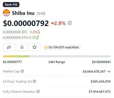 虽然 SHIB 在图表中的价格为 0.00000793 美元,但拥有 1,000,000(100 万)个 SHIB 代币现在的成本不到 10 美元。8 美元的投资可以为您带来 100 万个 SHIB 代币,而且这个价格对于持有者来说似乎非常实惠。这是 2023 年 6 月 SHIB 跌至 0.000005 美元水平后的最低水平之一。