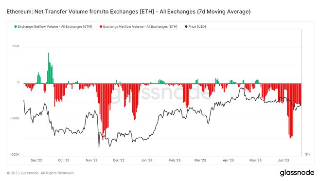 不过要注意的是,虽然从交易所提款大幅增加、质押量持续上升的状况,可能表明投资者想长期持有ETH,但这些提款行为也可能只是因为SEC 在6 月开启对交易所的一系列打击下,衍生的避险性提款、并不一定代表着卖压衰退、价格即将上涨,投资者仍需持续观察市场走势。