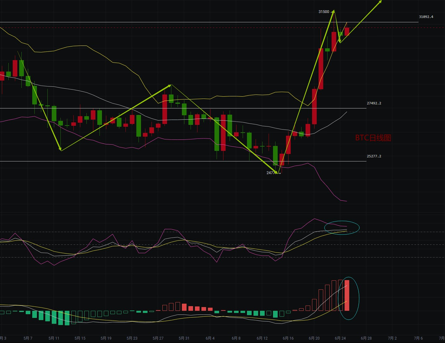 BTC短线4小时行情日内凌晨下探BOLL中轨一线后反弹,当前BOLL略微开口,KDJ指标三线在45轴金叉向上,MACD指标绿色空心动能柱缩量减量,短线行情目前走势有继续呈梯度上涨的趋势,日线行情6月24日K线呈下插针阴K,6月25日K线目前呈实体阳K,K线呈压在31000整数关口一线,K线目前继续运行在BOLL上轨一线,KDJ指标三线在80轴上方运行,MACD指标红色实体动能柱缩量,从日线来看,目前行情有继续上涨的趋势,行情目前还未有见顶信号出现,每日回撤低点在不断抬高,行情还有继续上涨的空间,建议还是以低多为主