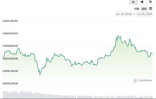根据全球币价网站CoinGecko数据,最近7个交易日里,比特币交易价格从26500美元下方逐渐攀升,突破30000美元关口后横盘震荡,在6月24日一度达到31185.22美元。截至6月25日18时10分,比特币报30694.83美元,日内涨幅为0.02%。