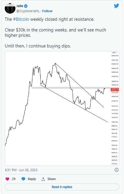 交易员同行 Jelle 对此表示同意,并预测一旦 30,000 美元被永久处理,就会出现新的上涨。