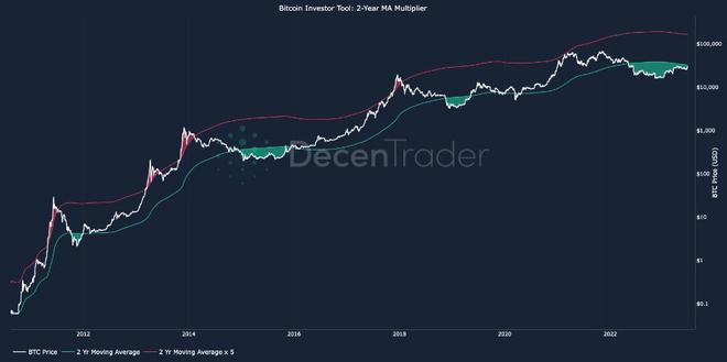 交易套件DecenTrader标记了比特币目前上方的关键阻力位,其两年移动平均线(MA)略高于32800美元。“从历史上看,2年移动均线在下一个减半周期之前提供了绝佳的积累机会。”