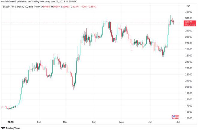 周二(6月27日)亚市,比特币继续持稳于整数关口上方,报在30394等待新一轮冲高。香港汇丰银行(HSBC)自本周起,允许其客户买卖香港交易所上市的加密货币ETF。美国证监会审批现货ETF时间点也曝光,即8月将会出现新结果。分析师强调,比特币大幅度回调极不可能发生,将试图突破32800美元关键阻力位。