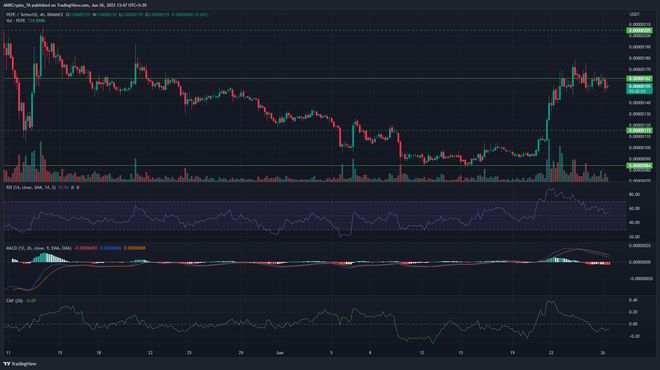 6 月 24 日,四小时蜡烛收盘价低于阻力位,导致横盘走势,图表上的 PEPE 指标看起来并不好。