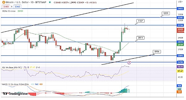 相反,如果比特币成功突破 31,000 美元水平,下一个值得关注的目标约为 32,500 美元。如果这种势头持续下去,后续目标可能会在 34,000 美元左右。