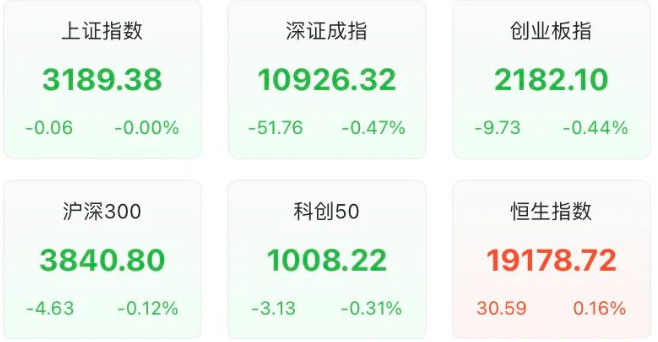 截至收盘,沪指跌0.00%,报收3189.38点;深成指跌0.47%,报收10926.32点;创业板指跌0.44%,报收2182.10点;沪深300跌0.12%,报收3840.80点。