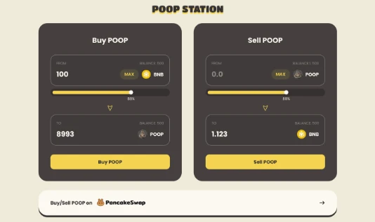 除了 Shitcoin Recycle 协议外,POOP Station 是 Poop 协议中,$POOP 代币的铸造、销毁场所。在 POOP Station 中,用户可以通过该交易枢纽,通过 Layer 1 代币来购买或者出售 $POOP 代币。而在这个过程中,将持续的产生 $POOP 代币的通缩与赋能,以帮助 $POOP 代币构建更为坚固的价值基础。