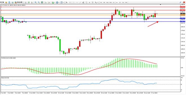 CMTrade指出,4小时图看,比特币短线震荡高位,市场多头情绪逐渐显现,短线有持续上行迹象,MACD指标处于看涨区域维持盘整,RSAI指标弱势徘徊50平衡线。