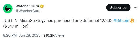 微策略创始人塞勒(Michael Saylor)发推称,公司在4月29日至6月27日期间,再次以28136美元的均价买入12333枚比特币,花费约3.47亿美元。