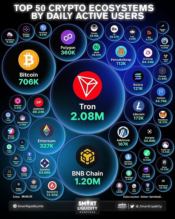 Smart Liquidity Research:波场TRON高居“日活跃用户数TOP50加密生态系统榜单”第一