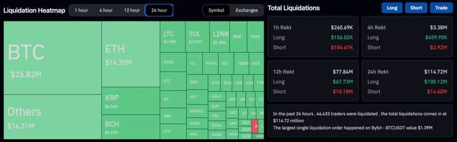 震荡下跌的行情,据Coinglass数据显示,过去24 小时内,有4.4 万人遭清算,全网爆仓金额达1.14 亿美元。其中,比特币爆仓额最大,达2,682 万美元,以太币爆仓额名列第二,达1,631 万美元。