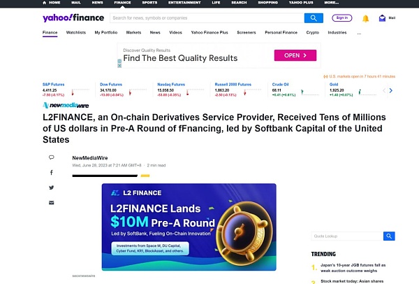 2023年6月27日-L2Finance,作为金融衍生品服务的领导者,再次成功地获得了一轮数千万美元的前 A 轮融资。我们很高兴地宣布,本轮投资由世界知名的美国软银投资牵头。与此同时,Space M、 DU Capital、 Cyber Fund、 KR1、 BlockAsset 等重量级机构共同参与,总投资额达数千万美元。