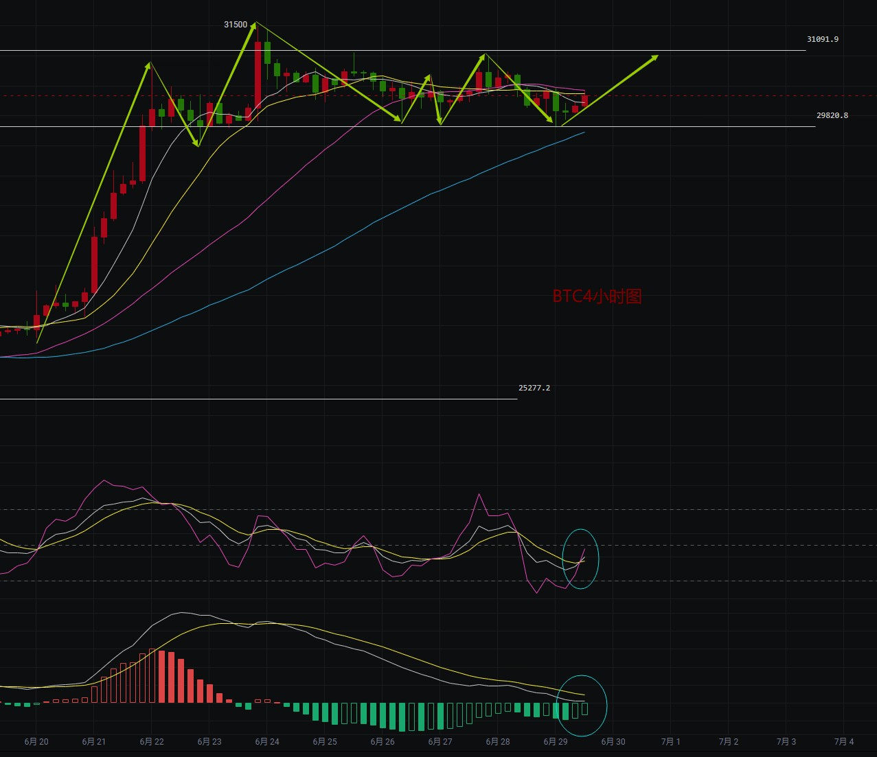 BTC短线4小时行情在早间再次下探29800附近支撑反弹,行情在本周处于区间震荡,行情上方承压31000一线,下方支撑29800一线,KDJ指标三线目前呈金叉向上,MACD指标绿色空心动能柱缩量,日线6月28日K线呈光头阴K,6月29日K线目前呈光脚阳K,K线目前承压在MA7均线下方, KDJ指标三线在80轴金叉转死叉向下,MACD指标红色实体动能柱连续缩量减量,从日线来看,主图K线目前处于高位震荡,而附图指标有明显回踩信号,日线目前走势有以震代跌的迹象,关注下方29700--29500区间支撑,上方关注31000一线压力,建议还是以低多为主