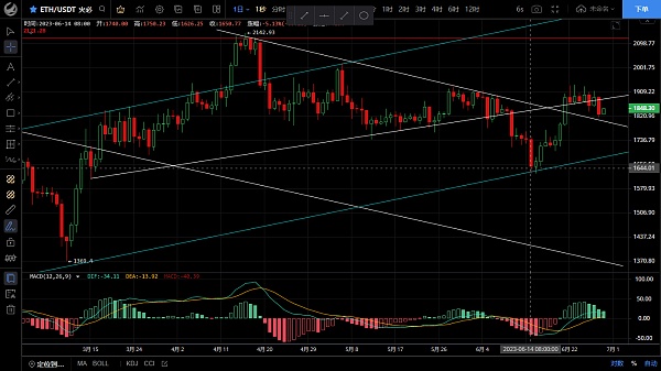 以太坊昨日和大饼一致呈震荡下行,期间虽有反弹但未能延续,空头力度较强,最低跌至1815一线支撑反弹,恭喜跟上昨日思路的朋友,目前币价在1838附近运行,四小时级别从盘面可以看出行情整体呈阶段式下跌,低点逐步降低,macd空头放量双线死叉向下,沿ma7均线向下运行,目前伴随着支撑反弹,但力度较为一般,有跌破1800关口的可能,短期先关注ma200支撑情况,日线来看k线首次回踩ma14均线支撑反弹,行情连阴走出空头排列,多头逐步缩量快线拐头向下,整体走势偏向于震荡回调,思路建议反弹高空为主低多为辅,上方压制1850-1880,下方支撑1820-1800