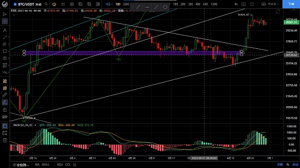 大饼昨日整体呈下行走势,跌至30000关口支撑反弹,但未能延续多头继续下行,最低跌至29850一线,恭喜跟上昨日思路的朋友,目前币价在30300附近运行,四小时级别k线高点逐步降低,ma7均线向下指引,行情回踩支撑后反弹但力度偏弱,macd空头运行双线死叉向下,近期整体走势更偏向于震荡回调,内心完美的做多位置在28880附近,当前29200也可以轻仓参与防止踏空,当前走势多头缩量,不断破位前低,走出空头排列,整体来看还有下行空间,思路建议反弹先空后多,上方压制30500-30800,下方支撑30000-29500