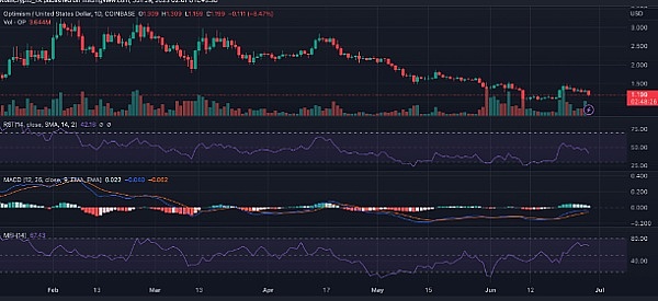 除了上述数据之外,查看 OP 的日线图也可以清楚地了解对山寨币的预期。在撰写本文时,OP 的交易价格为 1.199 美元。该代币的交易价格比当日开盘价低 8%。此外,相对强弱指数(RSI)虽然为 42.16,但仍处于下降状态。