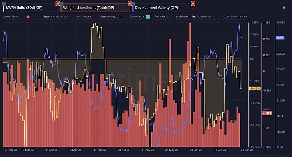 此外,尽管开发活动在过去几天有所上升,但截至 6 月 28 日,却出现了明显下降。这可能表明开发人员在开发方面没有做太多事情。同样令人担忧的是,OP 的 MVRV 比率在 6 月 17 日达到峰值后出现下降。