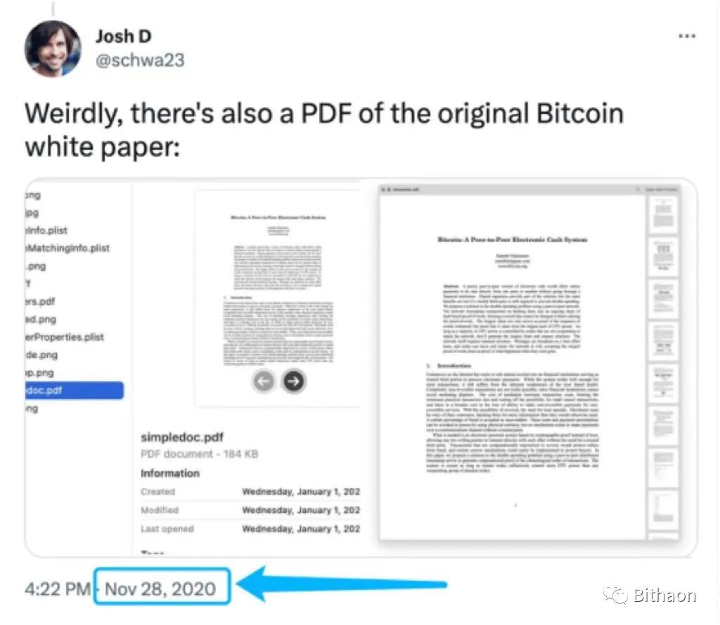 AndyBaio表示他问了十几个朋友和MAC的用户,每个人都有一份名为“simpledoc.pdf“的文件,打开一看,果然是中本聪2008年公开的比特币白皮书。