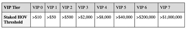 用户可以根据下表,通过质押 Hover 代币来加入 HOV VIP 等级。 这些等级将为用户提供许多好处,包括为借贷和清算支付的协议费用的回扣。 不同的等级还将包括访问代币特权(token-gated)群聊、提前访问新功能等等,以确保最长期、一致的用户获得 Hover 产品的最佳体验。