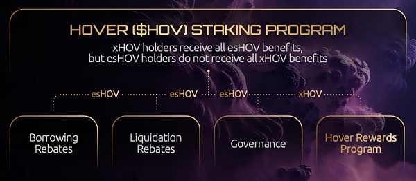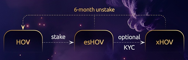 然后,用户可以参与可选的 KYC 流程,将其 esHOV 转换为 xHOV,并另外参与 Hover 奖励计划(Hover Rewards Program)。 esHOV 和 xHOV(又名“质押的 HOV”)都是不可转让的,并由 HOV(又名“未质押的 HOV”)支持,这意味着它们不能在交易所出售或从原始存款者的钱包中转移。