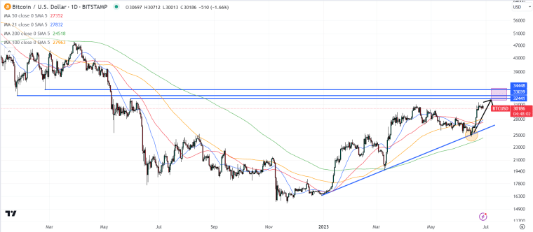 许多技术人员预计,比特币将在未来几天/几周内令人信服地突破 31,000 美元的年度高点,并继续迈向下一个主要阻力区域,例如 32,500 美元、33,000 美元和 34,500 美元。