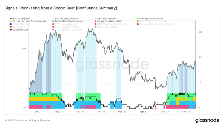 加密数据分析公司 Glassnode 广受关注的“从比特币熊市中恢复”仪表板跟踪八个链上和技术指标,目前显示 BTC 正处于牛市的早期阶段。