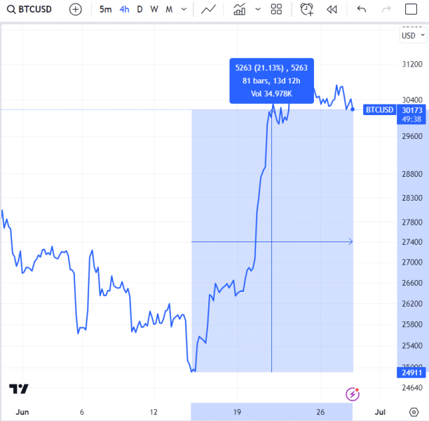 目前比特币价格略高于 30,000 美元大关,即将在 6 月份结束时实现 11% 左右的稳健涨幅。