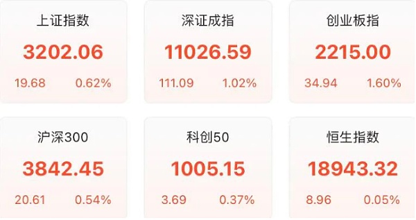 截至收盘,沪指涨0.62%,报收3202.06点;深成指涨1.02%,报收11026.59点;创业板指涨1.60%,报收2215.00点;沪深300涨0.54%,报收3842.45点。