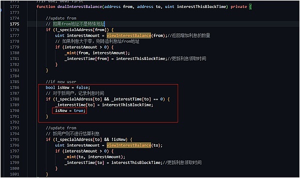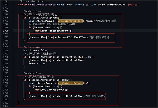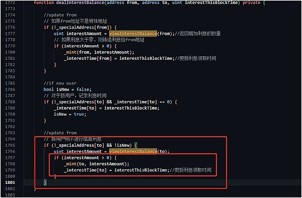 九天后,攻击者利用闪电贷,借出pair池子中的zero代币,给老地址转入zero代币(Pair-->B)。因为该账户余额为零,导致不会更新_interestTime。然后第二次,利用该地址转账,将触发B地址利息分红。(B-->C转账,将触发B的分红)