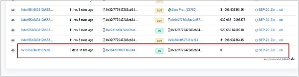 通过分析攻击交易的其中一个攻击地址,发现攻击者在九天前,攻击者向多个攻击地址转入0个zero代币。