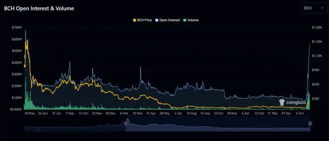 此外,BCH的飙升还伴随着其合约未平仓合约的大幅增加,达到两年来的新高5.62亿美元。自6月22日以来,BCH合约交易量较此前水平增长逾10倍,24小时交易量高达44.27亿。